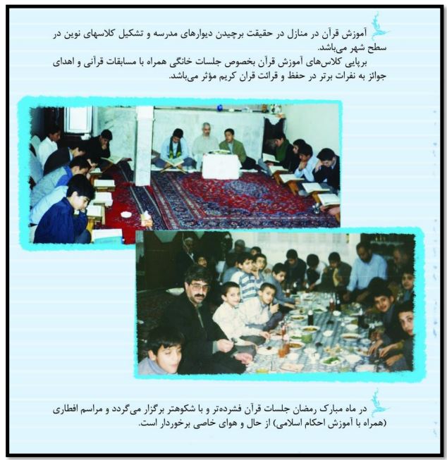 روزانه بعد از ورود دانش آموزان به کلاس درس، یکی از دانش آموزان یک صفحه قرآن می خواند و صدای ایشان در تمام کلاس ها پخش شده و سایر دانش آموزان همخوانی می کنند.