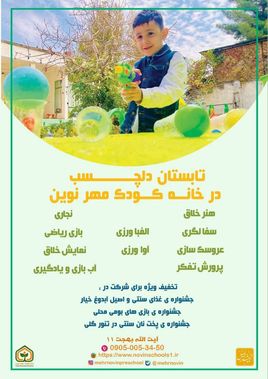 ثبت نام دوره "تابستان دلچسب و جشنواره هایش" خانه کودک مهر نوین (دوره تابستان ۱۴۰۳) ویژه گروه سنی ۴ تا ۸ سال ⛱️ روزهای زوج (شنبه،دوشنبه،چهارشنبه) ساعت ۹ تا ۱۲ لیست کارگاهها و ...